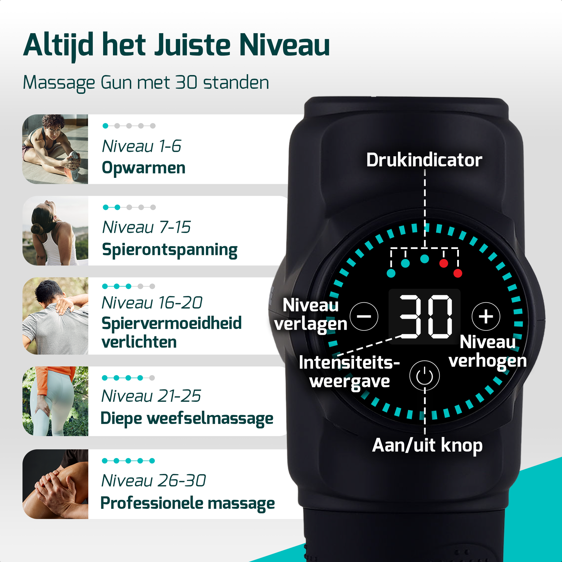 Het FITAGE massage pistool heeft maar liefst 12 opzetstukken. Dit zijn er meer dan je bij veel vergelijkbare massage apparaten krijgt. Elk van de opzetstukken is ontwikkeld om een bepaald probleem te verhelpen of een bepaald lichaamsdeel te masseren. De grote bal is bijvoorbeeld zeer geschikt voor grote spiergroepen als de benen, terwijl je met de platte kop de hamstrings en borst kunt masseren. Verder heb je onder meer een fork-head opzetstuk voor de wervels, en een bullet opzetstuk voor knopen en pijnlijke spieren. De precieze functies van alle opzetstukken lees je in de productafbeelding en onze mail.. De opzetstukken zijn eenvoudig te verwisselen, zodat je in één massage meerdere gebieden specifiek kunt masseren. Daarnaast heeft de massage gun maar liefst 30 standen, zodat je precies de intensiteit kunt kiezen die je nodig hebt en prettig vindt.